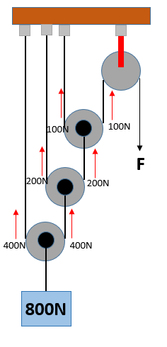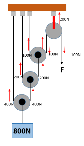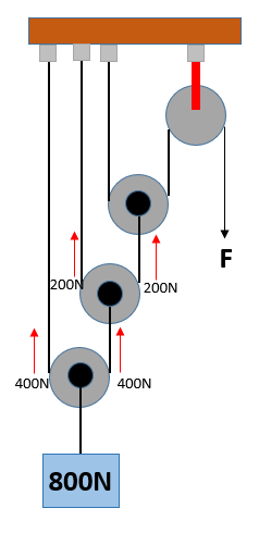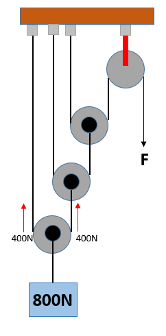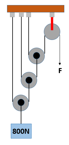 まず、下側の3個の滑車を動滑車、一番上の滑車を定滑車と言います。