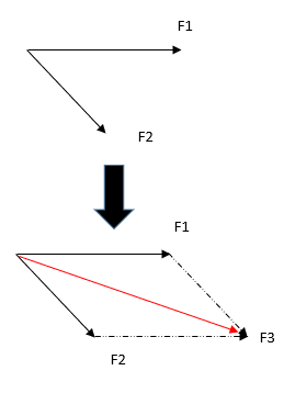 下の図のように向きの違うF1とF2の力を合成してF3とすることができます。