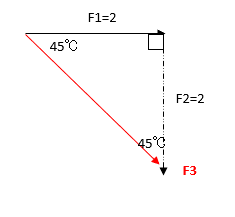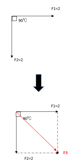 例えば下の図のように右側にF1=2、下にF2=2の力が働いた場合の力が働いています。