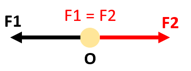 下の図のように中心Oに大きさが全く等しい力F1とF2が真逆の方向に作用する力の合力は0(ゼロ)となり、中心Oは静止したままになります。
